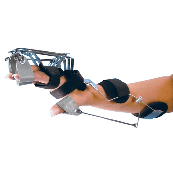 to dorsiflex the wrist and to extend the distal IP joints. Black felt-and-terrycloth-covered foam liner with elastic bands. Not made with natural rubber latex.