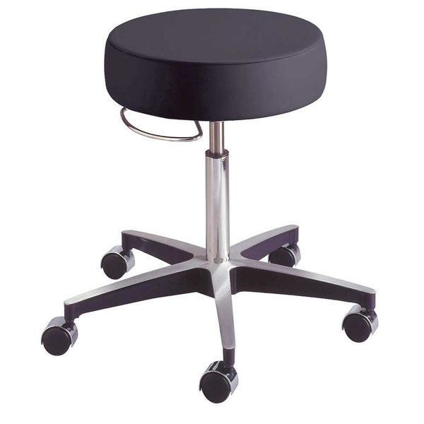 Our popular with 22" diameter cast brushed aluminum base has fingertip height adjustment that adjusts height from 18" to 24". Gray nylon casters are 2" in diameter. Stitched seam seat. Dual wheel nylon carpet casters. Stable five leg base. 250 lb. capacity.