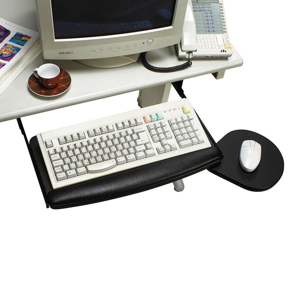 slide easily in and out, locking in the fully extended position to prevent tray from moving while in use. Integrated padded palm rest makes working more comfortable, while the easily accessible, teardrop-shaped mouse pad tray swivels out from under the tray for convenient storage. Installation is simple and mounts underneath most work surfaces for use with almost any workstation. Constructed from MDF, both keyboard tray and mouse platform are covered with black textured PVC. Drawer slides are finished in black zinc chromate. Mounting hardware and easy-to-understand instructions included. Black.