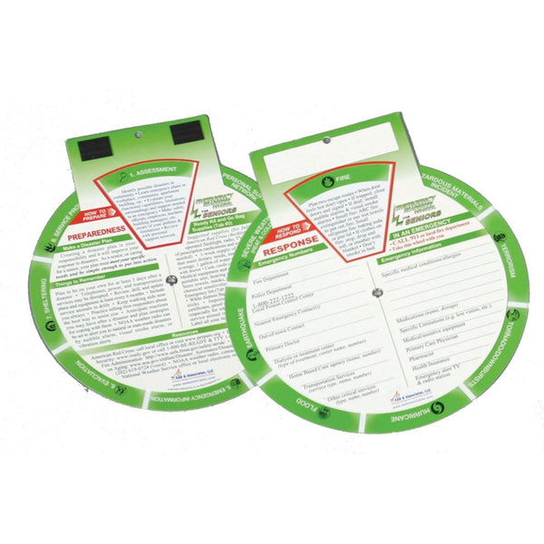 These Wheels offer a fresh approach to preparedness that is informative and easy to use! Wheel dimensions: 10-1/4" x9". To view a virtual demonstration, visit . Other languages available in large quantity special orders, call for details.