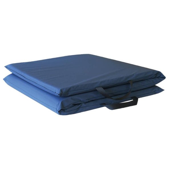 Essential safety measure for those susceptible to hip and other fall-related injuries. Durable 3-ply vinyl laminate cover. Antimicrobial cover is fluid-proof, mildew-resistant, meets CAL 117 fire code standards and easily wipes clean. Nonskid bottom reduces the risk of the mat slipping. Folds and has convenient carry handles. Navy.