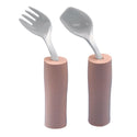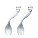 Pediatric Easy Grip Cutlery Curved spoons and forks give children a more natural grip on the handles. Molded of sturdy plastic, cutlery is non-injurious to lips and teeth. Available in Regular (two forks and two spoons in one package) and Built-Up handles (one fork and one spoon). Dishwasher-safe.