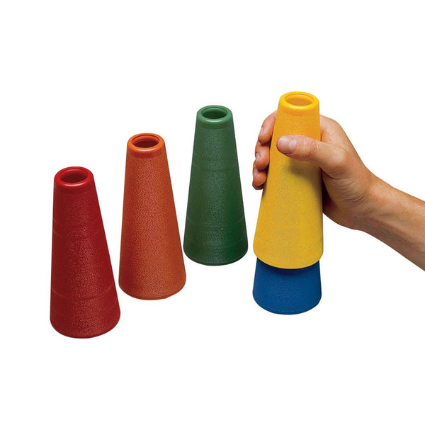 are impact-resistant and ideal for upper extremity rehab and evaluation, occupational therapy, hand and finger exercise and dexterity, reaching and grasping, hand-eye coordination, color identification, and perceptual training. The large plastic cones feature a slightly textured surface for improved grip, and can be handled easily by adults. Distributed by North Coast Medical. Each package includes cones in Red, Blue, Green, Yellow, and Orange. Pack of 30.