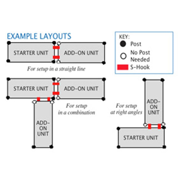 2. Expand your system: Choose additional shelves and posts as needed to create add-on units. S-Hooks and additional posts are required for each add-on unit.