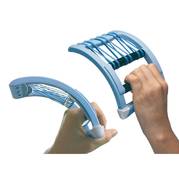 uses as curved design to facilitate controlled resistance and ROM hand exercise. By alternating position of the curve, different flexor and extensor muscle groups are exercised more effectively than with traditional strength exercisers. Padded finger bar, four range-limiting clips, and Yellow, Red and Blue rubber bands (three each). Not made with natural rubber latex.