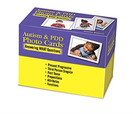 Autism & PDD Photo Cards Answering WHAT Questions is a unique photo card intervention tool. The 240 cards include therapy-rich instructions you can use in structured tasks or less-structured games. Question forms vary by grammatical features (present progressive, third person singular, and past tense) as well as by descriptive features (prepositions, attributes, and functions).