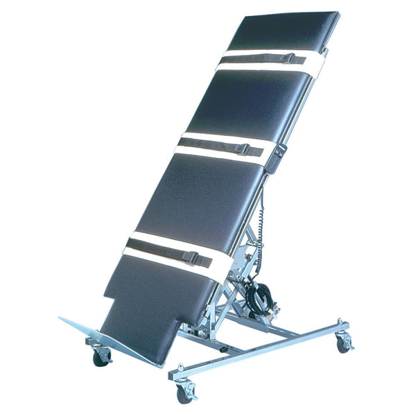 Bailey Professional Electric Tilt Table with pneumatic hand control pendant has an electric motor that assures smooth, vibration-free adjustment. Features three safety straps, 4" semi-pneumatic casters with step on brakes, welded steel construction, and 14" x 17-1/2" metal walk off plate with safety tread. Tilts from full vertical to 8º below horizontal.