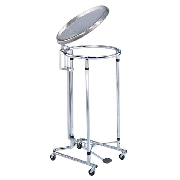 offers an 18-5/8" diameter ring constructed from 1" stainless steel tubing. 20"-diameter stainless steel lid with pin-drop pneumatic top for quiet operation. Spring-loaded, nonslip pedal allows for hands-free operation. Solid steel bag-rest at the bottom acts as a brace and protects hamper bags from the floor. Travels easily on 2" hard rubber casters.
