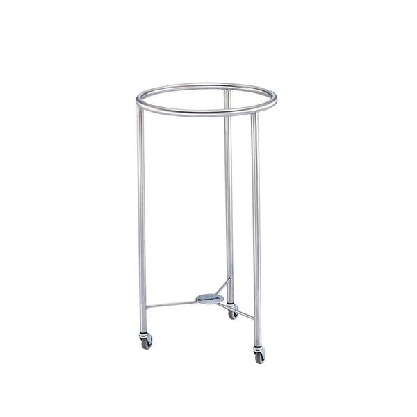 has a round, tubular ring seamlessly welded to three legs. A bag-rest at the bottom acts as a brace and protects hamper bags from the floor. Travels easily on 2" hard rubber casters. 3