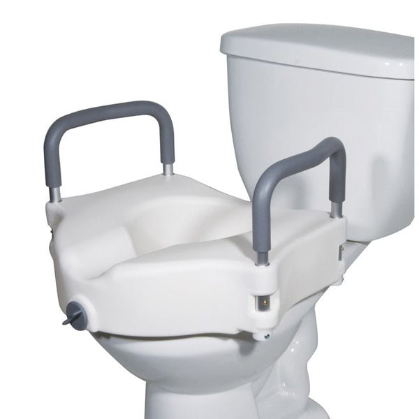 with tool-free removable padded arms, allows you to stock one product and fill the needs of two. Arms can be removed or added as needed. Foam padding extends entire length of armrest. Improved locking device is engineered with larger, heavy-duty worm screw and locking plate to ensure a safe, secure fit. Fits most toilets. White.