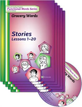 The stories are written using the words taught in Levels 1 and 2 of the Edmark Reading Program, Second Edition, and the Functional Words Series. Each kit contains five books that cover 20 lessons each: Lessons 1–20, Lessons 21–40, Lessons 41–60, Lessons 61–80, and Lessons 81–100. One story is provided for every two words taught in the lessons. These target words are the focus for the stories and stories activities. Once a word is taught, it may also be used in subsequent stories within the kit.