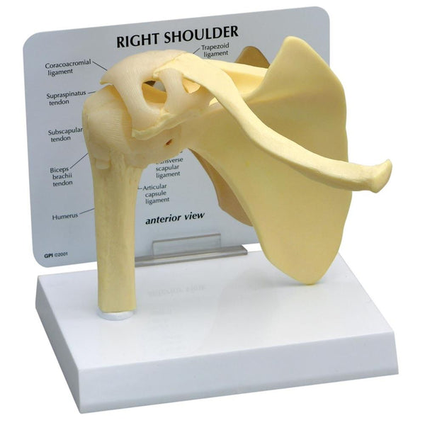 GPI Anatomicals Basic Shoulder Model Full-size normal right shoulder model includes: clavicle, humerus and scapula bones, articular capsule ligament, teres minor tendon, plus 11 additional ligaments and tendons on patient education card.