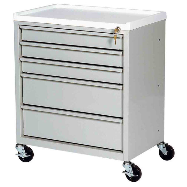 23-3/8"W x 27-2/5"H x 15-1/3"D • Unibody steel with powder-coat finish • Removable plastic top • Roller drawer slides • 3" stem casters, 2 with brakes • Drawers have integrated pull handles • Drawers: (3) 2-3/4", (2) 5-3/4" • Key lock • Ships freight