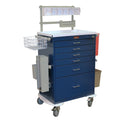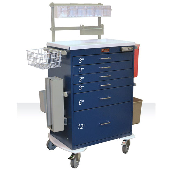 32"W x 42-1/2"H x 22"D • Full wraparound bumper on separate unibody steel frame with powder-coat finish • 2-tier raised back-rail system with two horizontal rails • Ball-bearing full-extension drawer slides and 5" swivel casters (1 directional and 1 braking) • Drawer configuration: (4) 3", (1) 6", (1) 12" • (2) 3" and (2) 6" exchange trays • 2 adjustable exchange trays w/dividers for 3" drawer (tray fits 2 per drawer) • 6-compartment tilt-bin organizer • 2-gallon waste container • Tape and label dispenser • 18" catheter box holder • 3-gallon sharps container with bracket • 171 lbs. • 12-year warranty • Ships freight