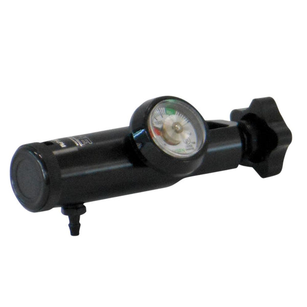 The provides a variable flow with 12 click stop flow rate settings has an aluminum unibody “window” design and has all brass flow channel internal components for safety. One Hose barb on low pressure variable flow port.