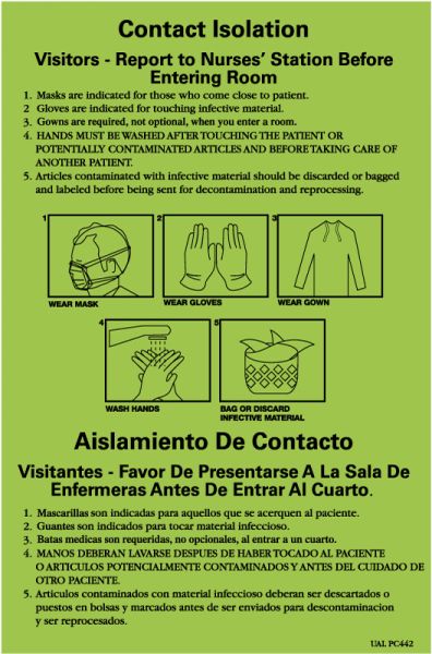Product Text: Contact Isolation Visitors - Report to Nurses' Station Before Entering Room 1. Masks are indicated for those who come close to patient 2. Gloves are indicated for touching infective