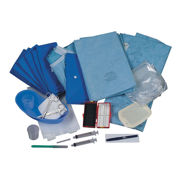 Contains: 10 ml Leur Lock syringes (2) • 3/4 sheet drape, 53"W x 77-3/4"L • 28"W x 36"L band bag w/tape • Paper bedside bag • Emesis basin • Bouffant cap, 24" diam. • Face mask w/loops • X-Large gown, non-reinforced • 4"W x 4"L 12-ply gauze (10) • Blank label sheet • Dual skin/utility marker • 2 oz. medicine cups (2) • 5" curved mosquito forceps • 20-count needle counter • 18-gauge, 1-1/2" needle • 5-1/2" straight O.R. scissors • O.R. towels (7), Blue • #11 stainless steel scalpel • 44"W x 76"L table cover • 5-3/4"W x 4"L transpore dressing