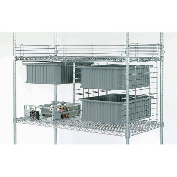 allow you to suspend trays and tote boxes between shelves to save space. Chrome finish. 24"L. 22 lbs. Case of 2. Use on shelves spaced at least 22" apart. Slides adjust on 1-1/2" centers. Each pair holds up to three 5" and 6" Nexel, Modu-Boxes (sold separately).