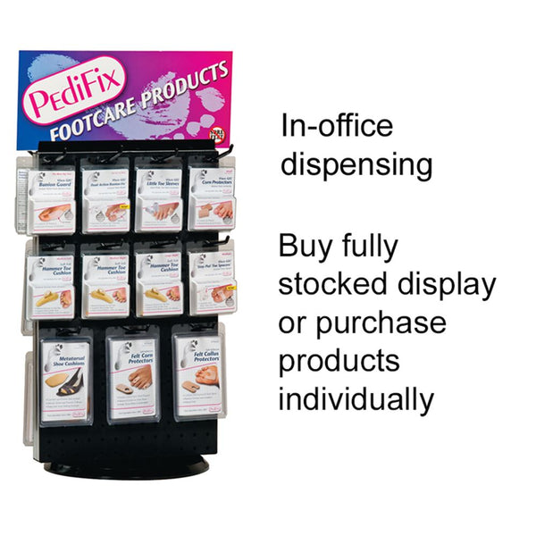 Convenient dispenser is stocked with products to help relieve common foot irritations such as corns, blisters, and ingrown nails.Contains 3 each of: FELTastic Corn Protectors, FELTastic Callus Protectors, Visco-GEL Little Toe Sleeves, Visco-GEL ToeBuddy, Visco-GEL Bunion Guard, Visco-GEL Dual-Action Bunion Fix, Podiatrists’ Choice Toe Straighteners, Arch Support Bandages, Pedi-Smart Heel Hugs, “4 in 1” Super Soft Toe Cushions, Podiatrists’ Choice Ball-of-Foot Cushion—OSFM, 3-Layer Toe Separators (2 each of Small, Medium, Large), Tubular-Foam Toe Bandages (1 each of Small, Medium, Large); 2 each of Visco-GEL Stay-Put Toe Spacers (Medium), Visco-GEL Toe Spacers (Medium), Visco-GEL All-Gel Toe Cap (Large), Visco-GEL Corn Protectors (Small), Visco-GEL Fabric-Covered Toe Protector (Small), Peel-Away Adjustable Heel Lift (Medium); 1 each of Visco-GEL Stay-Put Toe Spacers (Large), Visco-GEL Toe Spacers (Large), Soft Felt Hammer Toe Cushion (Small, Medium, Large, left and right), Visco-GEL All-Gel Toe Cap (Small), Visco-GEL Corn Protectors (Large), Visco-GEL Fabric-Covered Toe Protector (Large), Peel-Away Adjustable Heel Lift (Large). Replacement products available.