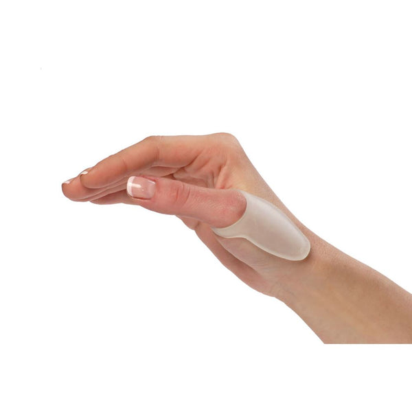 cushions and protects thumb from trauma, pressure, shock, and shear. Thin design fits under splints or braces. Position on side of thumb or on palm. Slowly releases mineral oil and vitamin E to soften and moisturize skin. May also improve appearance of scars. Fits left or right.