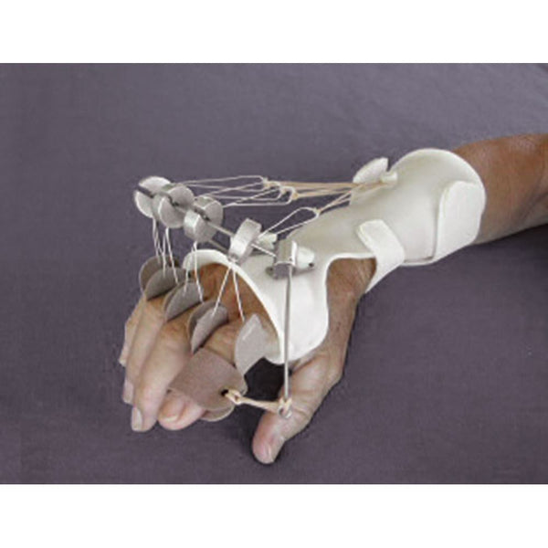 for mounting to a custom-fabricated thermoplastic splint base. Fingers are positioned by sliding the slotted pulleys along the retaining rod.