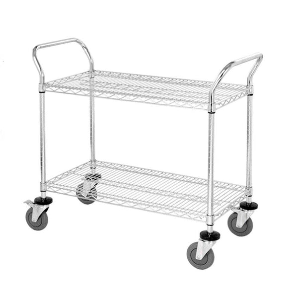 This two-shelf cart is useful for storage and transportation needs, offering versatility in any operation: food service, hospitals, and manufacturing. Features two u-handles, four donut bumpers, and four swivel casters (2 with brakes).