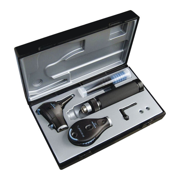 ri-scope L Sets are great for portable use. All sets supplied with hard case with safety catch; tubes with 4 black reusable specula (sizes 2-5mm) and 3 disposable specula (2.5mm and 4mm); 3.5V Xenon Ophthalmoscope (L1 or L2); 3.5V LED Otoscope; choice of A-, C-, or Plug-in style handle; and two Li-ion batteries.
