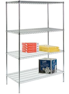 come complete with 4 shelves and four 72" round posts. The plated shelves and posts are durable and easy to clean. Adjustable feet assure level positioning.