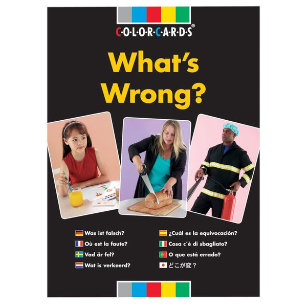 Speechmark ColorCards What's Wrong? Great new photos to stimulate visual observation, thinking skills, and language. Large, sturdy, full-color photographs show mistakes in everyday scenes. Situations range from the obvious (a picture hanging upside down) to the subtle (too many clothes for a small suitcase). All age levels are depicted for use with a wide variety of clients.