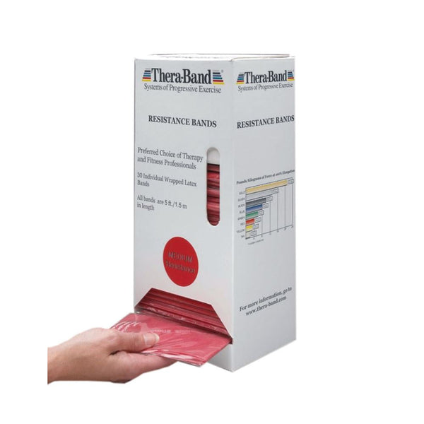 Thera-Band Resistance Bands Dispenser Pack is a convenient way to distribute individually wrapped, pre-cut Thera-Band latex resistance bands. Each dispenser includes 30 folded, individually packaged 5' bands in a single color. Each band includes safety instructions. Available in Yellow, Red, Green, Blue and Black.