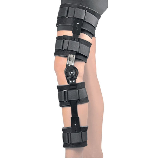 Push-button telescoping hinge arms adjust in length from 17" to 24" in 1/2" increments. Flexion/Extension adjusts without use of pins or tools in 10° increments with pull-and-position knobs from 0-120° flexion and 0-60° extension. Indicated for ACL, PCL, MCL, LCL injuries, meniscal repairs, patella tendon repairs, condylar fractures, sprains/strains of the knee, and total knees. One size. Fits left or right. Specify full or cool liner.