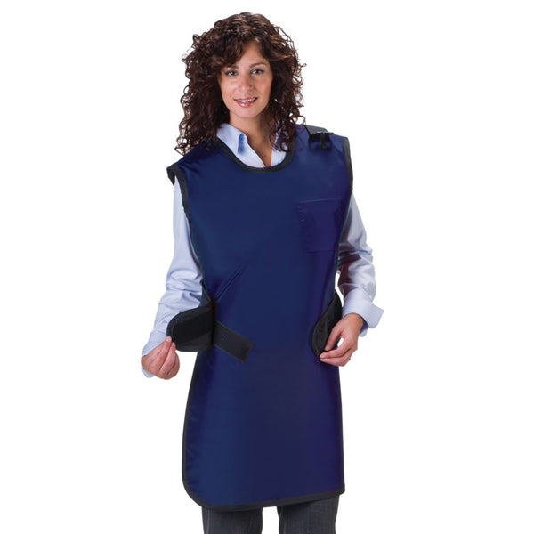 Standard lead aprons for when you need protection… fast. Easy Wrap style features wide adjustability with two oversized hook-and-loop patches. Crisscross back straps help keep apron on the shoulders and redistribute weight from the shoulders to the hips for greater comfort. Armholes bring the protection up close to the axilla and provide better back coverage. Not made with natural rubber latex. Available in Medium and Large. Navy Blue.